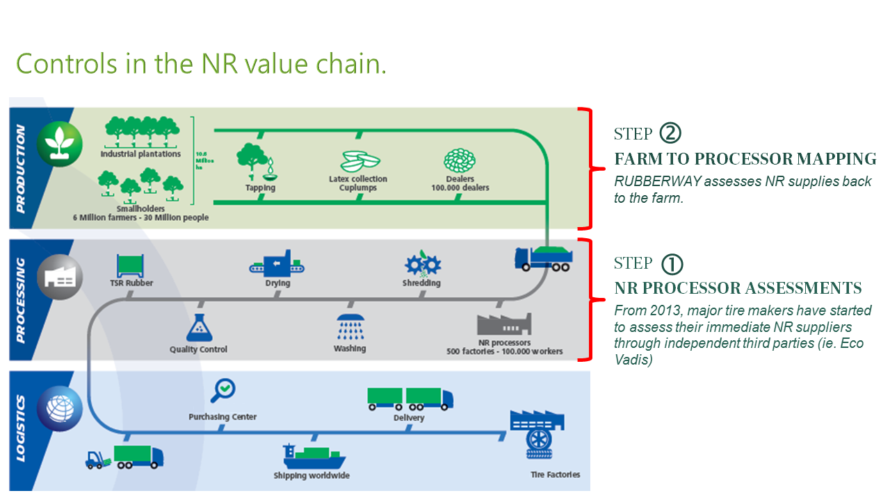 Um diese und andere Risiken in der Lieferkette zu mindern, nutzen Michelin und die Continental AG zunächst EcoVadis Ratings, um eine Bewertung ihrer Tier-1-Lieferanten und eine Selbsteinschätzung der Nachhaltigkeit in der vorgelagerten Kette zu erhalten. Im zweiten Schritt fordern die bewerteten Unternehmen dann ihre vorgelagerten Zulieferer auf, die RubberWay-App zu nutzen, um über die wichtigsten Nachhaltigkeitsthemen zu berichten. Die Gruppen verwenden diesen zweistufigen Ansatz seit 2013, bereits vor der Entwicklung der App, und haben festgestellt, dass es eine wirksame Methode ist, um den Sektor zu einer verantwortungsvollen und sicheren Landwirtschaft zu führen.