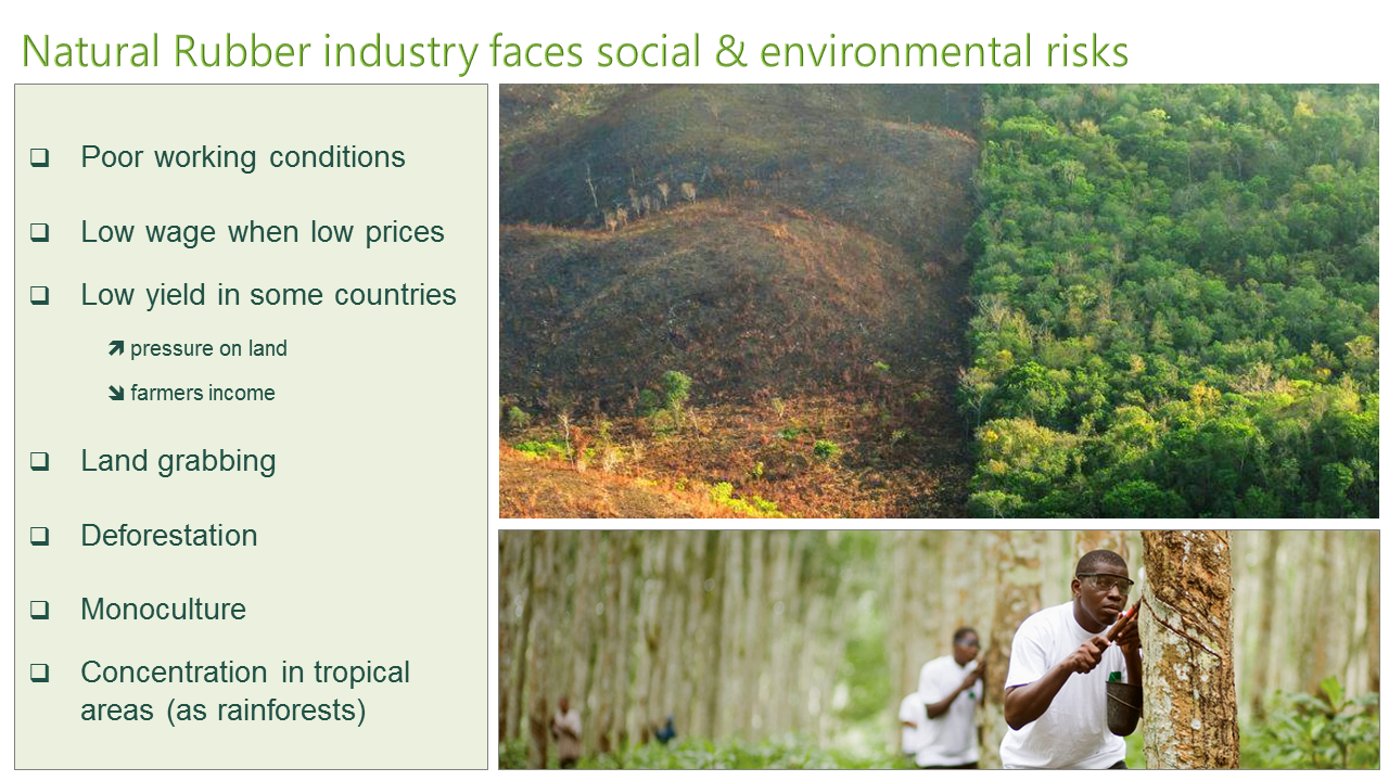 Der überwiegende Teil des weltweiten Naturkautschuks stammt aus kleinen Kautschukbaumplantagen mit einer Größe von zwei bis drei Hektar, die von etwa sechs Millionen Landwirten betrieben werden. Mehr als 90 % davon befinden sich in Asien, Afrika und Südamerika, wobei 36 % auf Thailand, 26 % auf Indonesien, 9 % auf Vietnam, 5 % auf Malaysia, Indien und Südchina und 6 % auf Westafrika entfallen. Infolgedessen ist die Branche sehr anfällig für Menschenrechtsverletzungen, einschließlich moderner Sklaverei und Kinderarbeit, wobei die Farmen besonders hohen Risiken ausgesetzt sind.