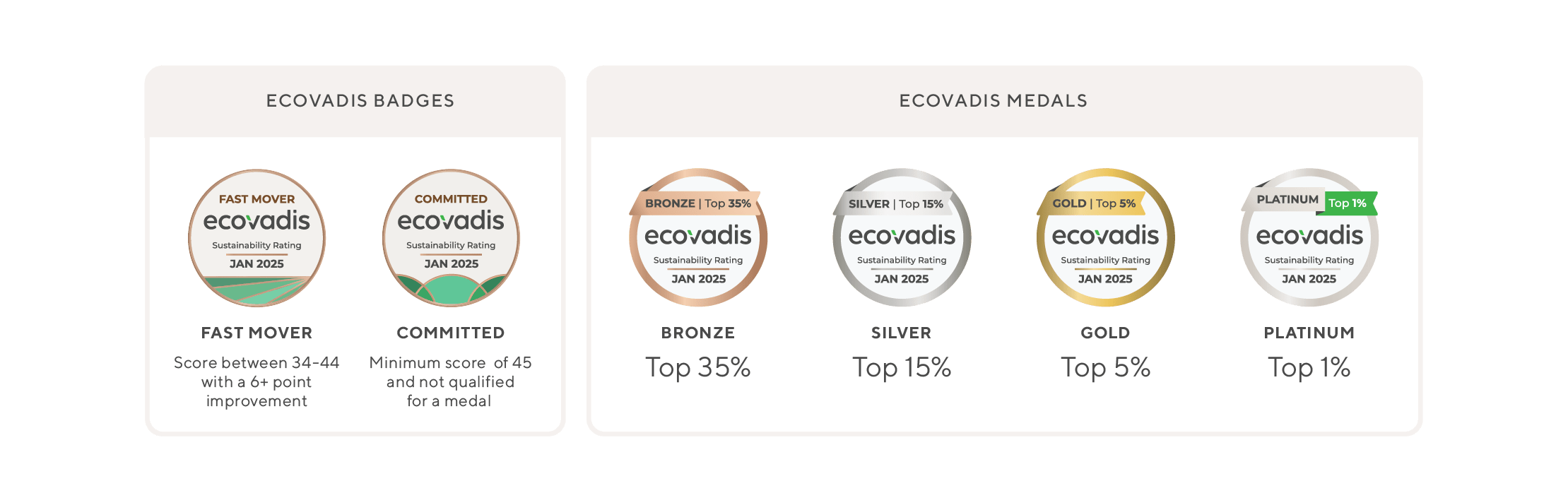 EcoVadis Medals and Badges recognize eligible companies that have completed the EcoVadis assessment process and demonstrated a relatively strong management system that addresses sustainability criteria, as outlined in the EcoVadis methodology.