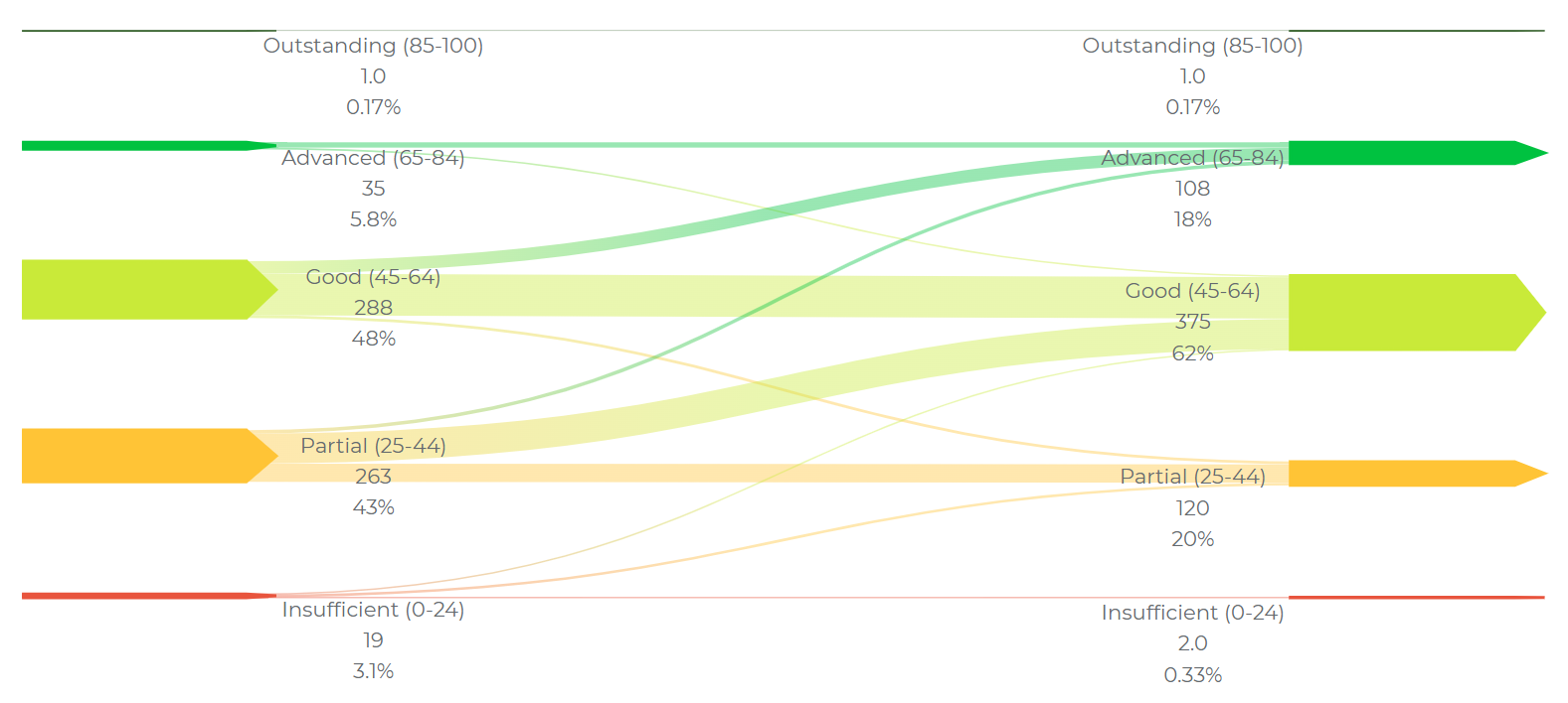 Meanwhile, insights from the 7th edition of EcoVadis’ Business Sustainability Index Report show how companies are leveraging the insights and support in the EcoVadis platform to reduce risks and build resilience throughout their operations. Taking North American as an example, nearly half of all companies rated in 2018 were performing at a Partial (25-44) level or below on sustainability (based on overall score across all ESG themes). The chart below shows how multiple assessments over a five-year period has mitigated risks. In 2022, the share of companies at the Partial level plummeted to 20% and the number at the Advanced level tripled.