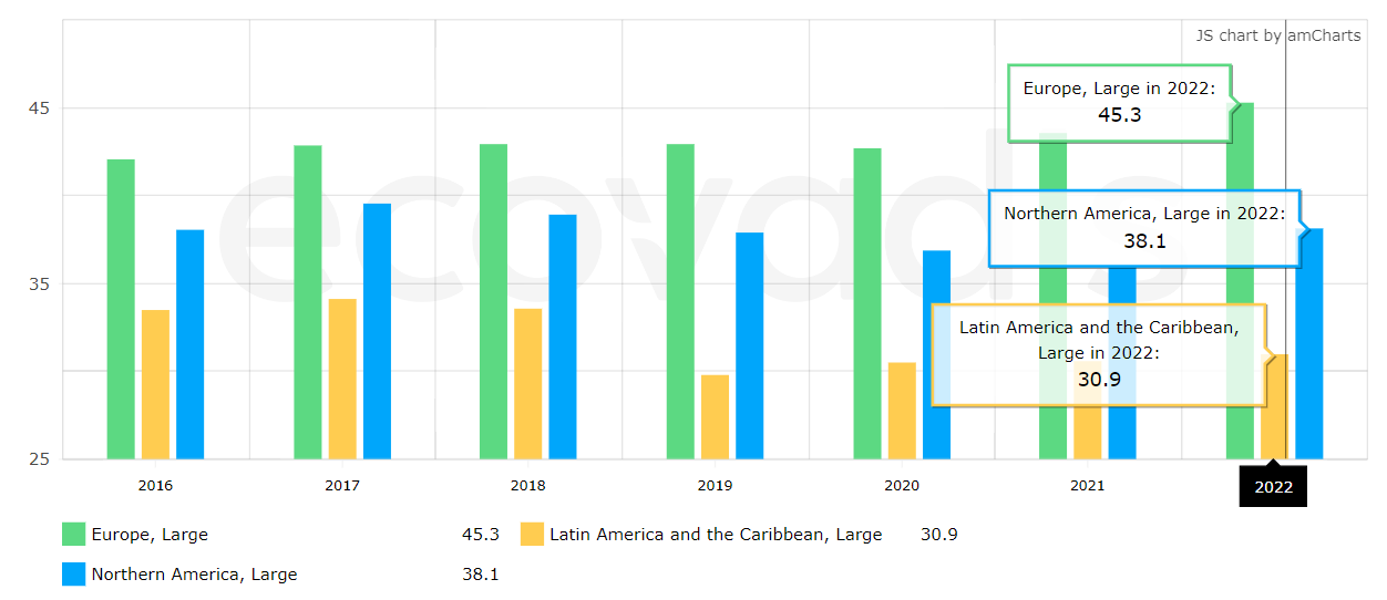Moreover, when looking deeper at the Sustainable Procurement (SUP) theme scores, almost three quarters (73%) of purchasing organizations in North America remain in the ‘risk’ range (‘insufficient’ or ‘partial’ level of management practices). Looking more specifically at the SUP scores for “Large” companies (over 1000 employees), despite reversing a four year declining score trend, 2022 SUP scores show they remain far more exposed to supply chain sustainability risk with an average score of 38 compared to European peers who are 7 points higher at 43.