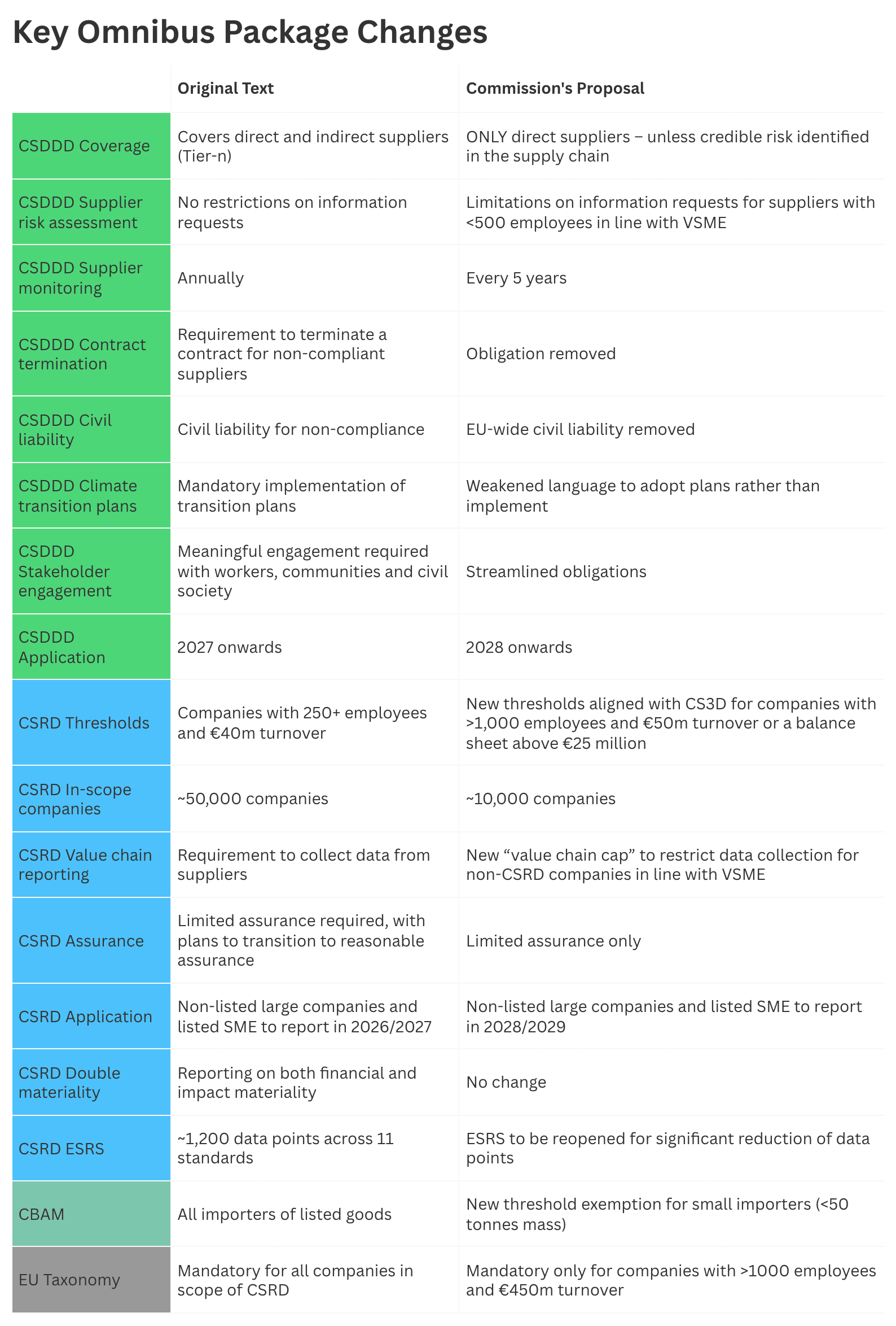 Omnibus-proposed changes to the CSDDD include restricting the due diligence requirements to direct suppliers (where previously companies were asked to follow the supply chain further) and only to suppliers with more than 500 employees. Supplier monitoring would only be mandatory every five years, instead of annually, and there would be no civil liability or due diligence requirements for financial institutions. The CSDDD implementation would also be delayed by a year, to 2028.
