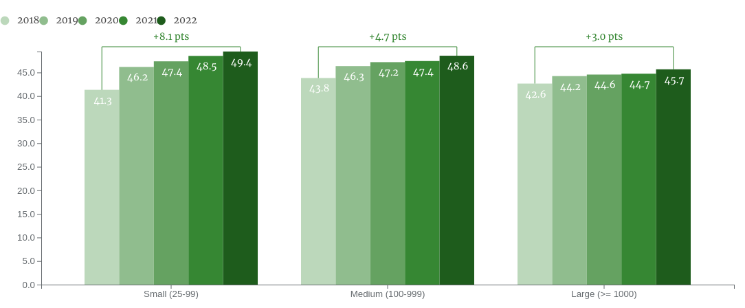 NA companies continue to make headway on sustainability, with their overall average rising to 47.9 in 2022. This puts the typical company just above the 45-point threshold on the EcoVadis scoring scale that indicates the presence of a more structured sustainability management system and policies and actions on key challenges. Much of the rise in the overall average since 2018 is being driven by small and medium-sized enterprises (SMEs). Small companies (under 100 employees) have gained 8.1 points over the past five years while their medium-sized (100-999) peers have tacked on 4.7 – significantly outperforming large companies (1,000+), which have gained just 3 points. This performance disparity by size is even more pronounced in Canada than in the US.