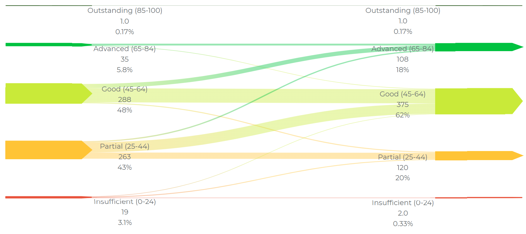 Nearly half of all NA companies rated in 2018 were performing at a Partial (25-44) level or below on sustainability. The chart below shows the impact of multiple assessments. In 2022, the share of companies at the Partial level plummeted to 20% and the number at the Advanced level tripled. Most of the companies that reached Advanced performance in 2022 came from the level below, but a small yet committed group was able to move up from the Partial category.