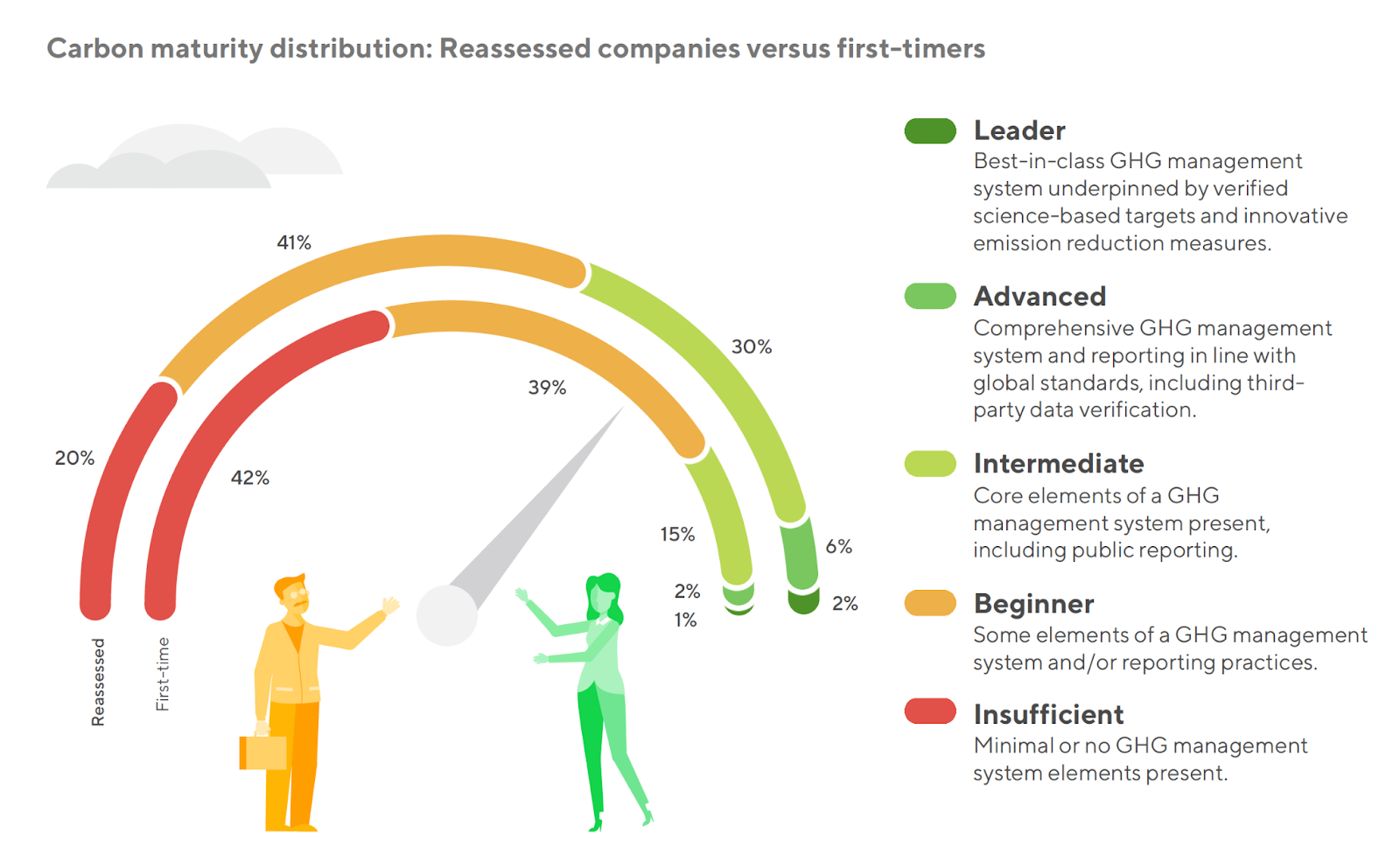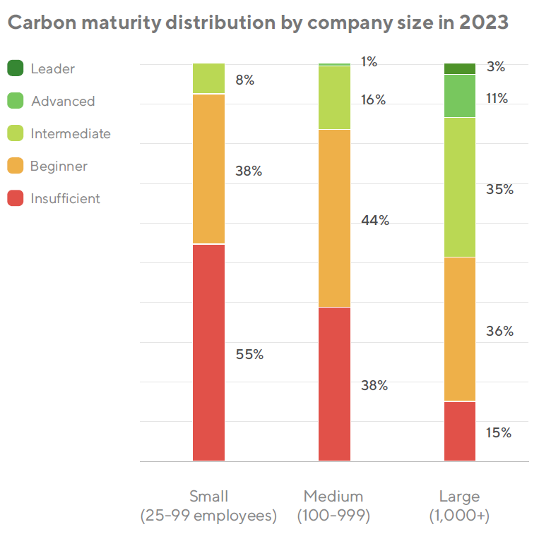 Große Unternehmen sind führend im Bereich der Carbon-Reife, was vor allem auf die gestiegenen Erwartungen des Einkaufs und den regulatorischen Druck zurückzuführen ist – 14 % befinden sich auf der Stufe “Leader” oder “Advanced” und 35 % auf der mittleren Stufe. Nur 15 % der Großunternehmen befinden sich auf der Stufe Unzureichend, verglichen mit 55 % der kleinen und 38 % der mittleren Unternehmen (KMU).