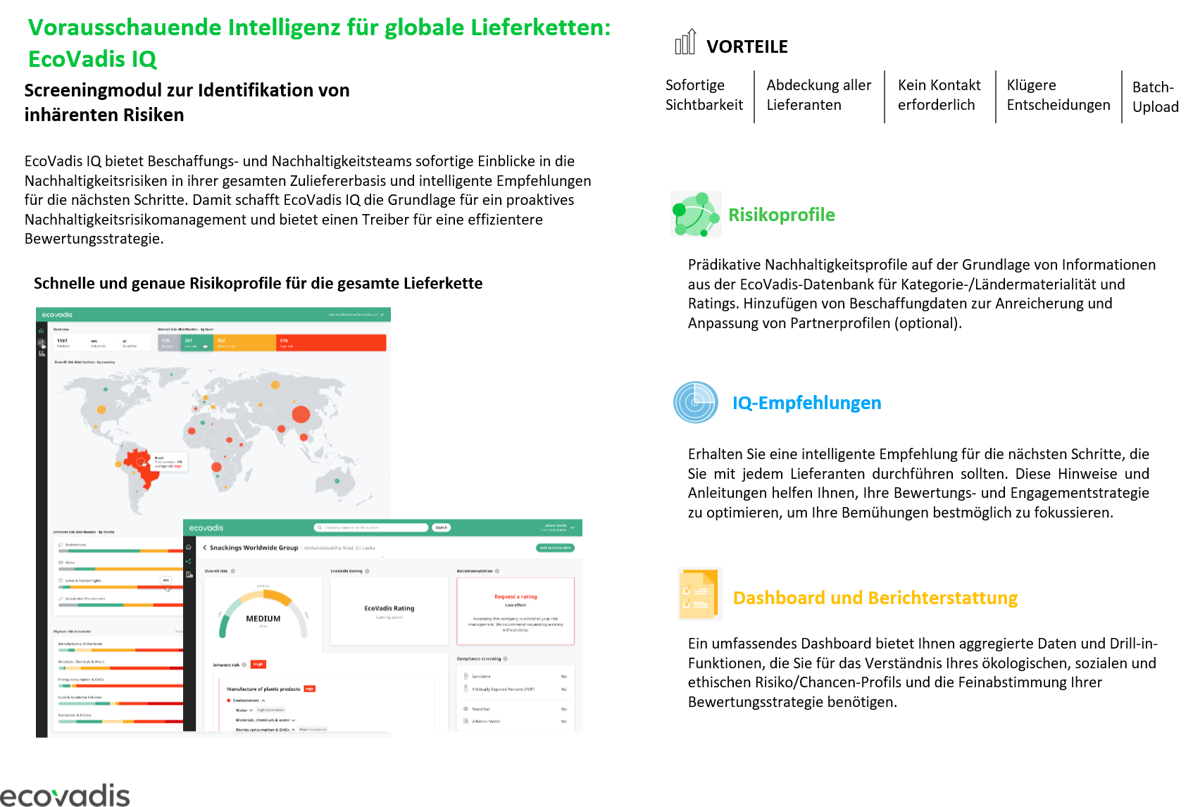 EcoVadis IQ bietet Beschaffungs- und Nachhaltigkeitsteams sofortige Einblicke in die Nachhaltigkeitsrisiken in ihrer gesamten Zuliefererbasis und intelligente Empfehlungen für die nächsten Schritte. Damit schafft EcoVadis IQ die Grundlage für ein proaktives Nachhaltigkeitsrisikomanagement und bietet einen Treiber für eine effizientere Bewertungsstrategie.