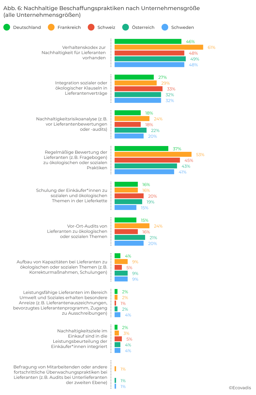 Die Größe eines Unternehmens hat entscheidenden Einfluss auf die Implementierung nachhaltiger Beschaffungspraktiken. In Deutschland haben 80 % der Unternehmen mit über 1.000 Mitarbeitenden einen Verhaltenskodex für Lieferanten etabliert, gegenüber nur 28 % bei Unternehmen mit 25-99 Mitarbeitenden und 46 % bei 100-999 Mitarbeitenden. Ähnliche Unterschiede zeigen sich bei Lieferantenbewertungen, Risikoanalysen und Trainings. Dies unterstreicht die Bedeutung von Skaleneffekten und interner Compliance-Kapazität.
