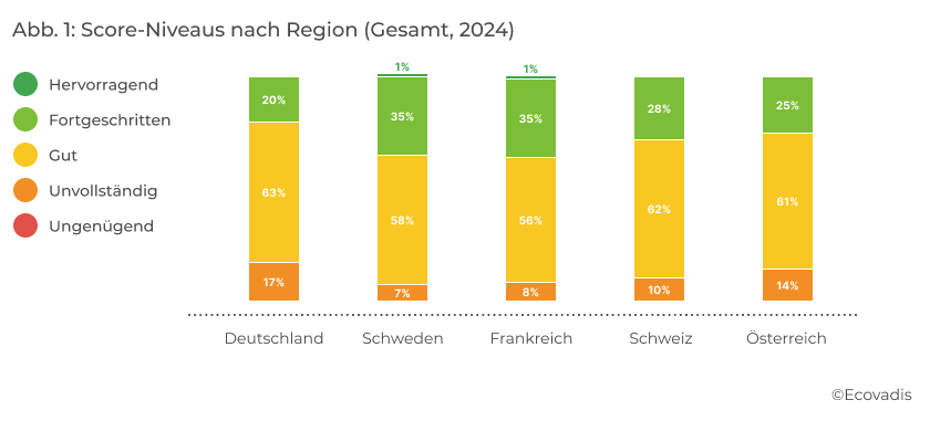 2024 erreichen 63 % der in Deutschland bewerteten Unternehmen die EcoVadis Kategorie “Gut” (Punktzahl 45-64), weitere 20 % erzielen “Fortgeschritten”-Bewertungen (65-84). Damit liegt Deutschland zwar über dem globalen Durchschnitt, jedoch deutlich hinter den Spitzenreitern Schweden und Frankreich, bei denen jeweils 35 % der Unternehmen als “Fortgeschritten” eingestuft werden. Auch im EU-weiten Vergleich (27 % “Fortgeschritten”) zeigt sich ein Aufholbedarf.