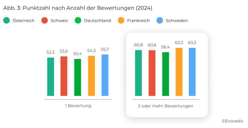 Die Wirkung kontinuierlicher Nachhaltigkeitsbewertungen zeigt sich klar: In Deutschland erzielen Unternehmen mit zwei oder mehr EcoVadis Ratings im Jahr 2024 durchschnittlich 58,4 Punkte – ein Plus von 8 Punkten gegenüber Unternehmen mit nur einer Bewertung (50,4 Punkte). Dieses Muster zeigt sich ähnlich in anderen Regionen. Die Zahlen belegen, dass Nachhaltigkeitsmanagement ein Reifeprozess ist, der durch Regelmäßigkeit, Feedback und Wissensaufbau messbar verbessert wird.