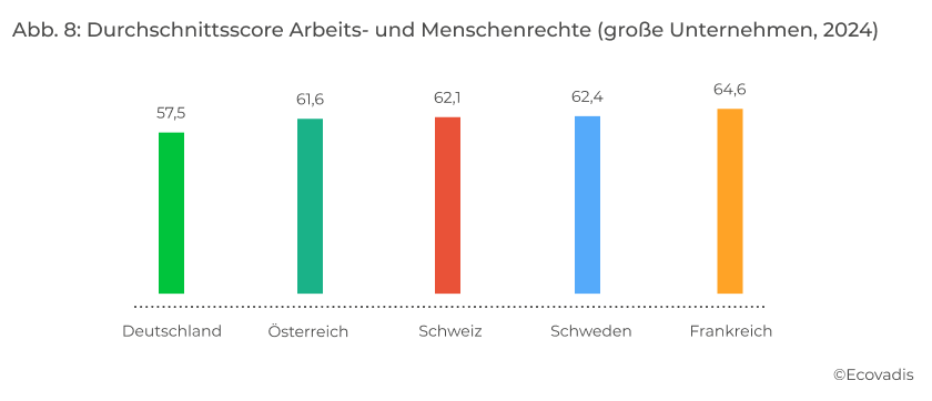 Im Bereich “Labor and Human Rights” erzielen große deutsche Unternehmen (>1000 MA) mit rund 58 Punkten ein gutes Niveau, liegen damit jedoch hinter Österreich, Schweden und Frankreich (alle über 60 Punkte). Dies verdeutlicht, dass trotz positiver Entwicklungen weiteres Potenzial in der menschenrechtlichen Sorgfalt liegt – insbesondere angesichts der zukünftigen Anforderungen der CSDDD.