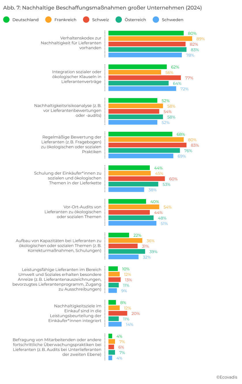 Ein genauer Blick auf die nachhaltigen Beschaffungspraktiken großer Unternehmen zeigt: Deutschland ist gut aufgestellt, bleibt im Vergleich jedoch zurück. Während 80 % der deutschen Unternehmen einen Supplier Code of Conduct etabliert haben, liegt Schweden hier bei 89 %. In Bereichen wie Lieferantenbewertungen (68 % in DE vs. 80 % in FR und 83 % in CH) oder Trainings für Einkäufer*innen (44 % in DE vs. 60 % in CH, 53 % in A) zeigt sich eine deutliche Lücke in der D-A-CH-Performance. Im Kapazitätsaufbau liegen alle betrachteten Länder im unterschwelligen Bereich unter 40 %, wobei Österreich hier mit 39 % vor deutschen Unternehmen mit nur 22 % vorlegt.