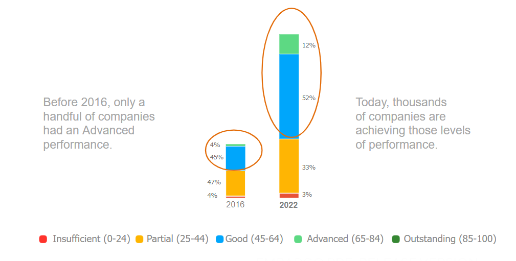Im Jahr 2024 wird sich die Landschaft drastisch verändern. Regulatorische Änderungen, der Druck von Stakeholdern und andere Faktoren haben dazu geführt, dass Unternehmen in allen Branchen enorme Fortschritte bei der Verbesserung ihrer Nachhaltigkeitsleistung erzielt haben. Das Nachhaltigkeitsbewusstsein und die Nachhaltigkeitsleistung haben sich im Vergleich zu 2014 in fast allen Branchen verändert. Der Anteil der Global-500-Unternehmen mit einem Netto-Null-Treibhausgasemissionsziel ist von weniger als 5 % vor 2015 auf 66 % im Jahr 2023 gestiegen; 18 000 Unternehmen sind Mitglieder des UNGC; 23 000 Unternehmen berichten an das CDP; 4264 haben wissenschaftlich fundierte Ziele und 2981 Netto-Null-Verpflichtungen durch die Science Based Targets Initiative.