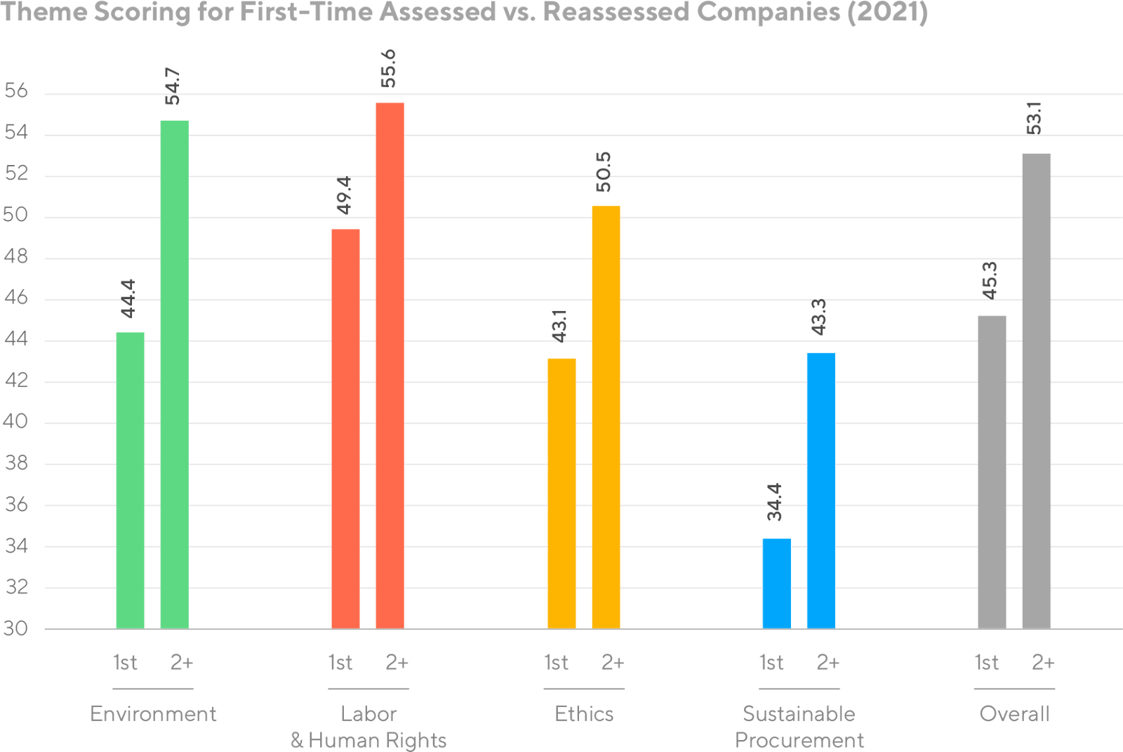 Es posible lograr una auténtica mejora si las empresas son consistentes en sus esfuerzos de sostenibilidad y ponen en práctica los aprendizajes del proceso de evaluación, tal como demuestra la curva progresiva en base al número de evaluaciones. Es evidente que las empresas reconocen el valor de la reevaluación; en 2021, hubo una clara diferencia entre las compañías evaluadas por primera vez y las más veteranas.