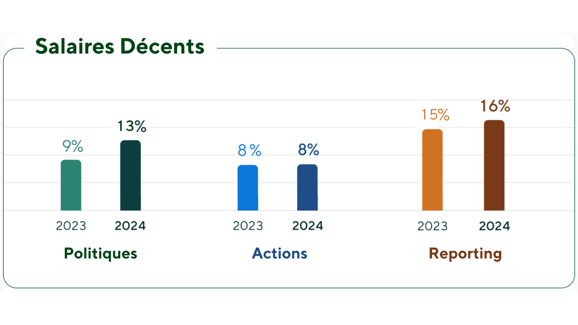 Cependant, nous observons une plus faible proportion d’entreprises démontrant des mesures prises pour combler l’écart de salaire décent, avec un stagnation depuis 2023 (8%)