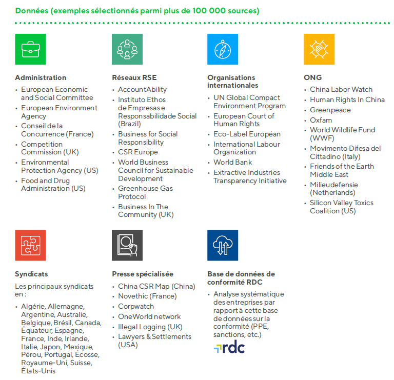 Le processus de sélection des “nouvelles” qui seront prises en compte combine l’intelligence artificielle et l’analyse humaine pour identifier pour chaque entreprise évaluée les plus pertinentes le plus souvent sur les cinq dernières années, tant positives que négatives. Ces informations sont complétées par des données provenant de la base de données mondiale d’informations réglementaires (GRIDTM), via RDC Regulatory Datacorp.