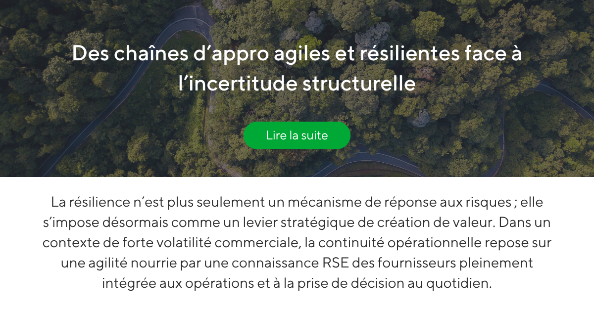 Les enjeux de durabilité ne se limitent aujourd’hui plus à la conformité : ils font désormais partie intégrante de la performance opérationnelle. Dans cette édition, nous verrons comment les entreprises les plus avancées sur le sujet instaurent un niveau d’exigence élevé sur l’ensemble de leurs marchés, en s’appuyant sur des données fournisseurs plus fiables et des dispositifs pensés pour renforcer leur devoir de vigilance et suivre l’évolution des cadres réglementaires. Nous mettrons également en lumière les nouvelles recherches qui montrent qu’une approche mature du devoir de vigilance peut contribuer à réduire les coûts sur le long terme, avant de revenir sur les derniers enseignements du Forum économique mondial et sur les raisons pour lesquelles résilience et agilité s’imposent aujourd’hui comme de véritables moteurs de compétitivité et de croissance.