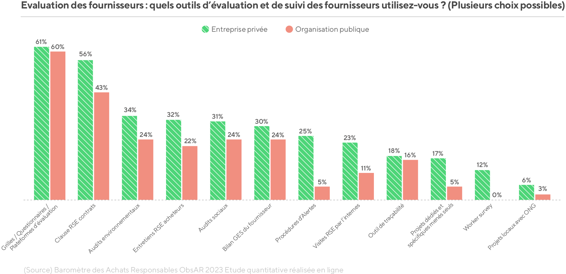 La combinaison des outils évolue, comme le prouve en France, le baromètre annuel ObsAR 2022. A niveau égal sur le recours aux clauses contractuelles RSE, le secteur privé se distingue du secteur public sur le recours aux audits sociaux ou environnementaux et aux campagnes d’évaluations fournisseurs régulières -gérées à l’interne ou par un tiers de confiance comme EcoVadis. Dans le secteur privé, 67% des donneurs d’ordre réalisent des campagnes d’évaluation RSE par questionnaire d'auto-évaluation (SAQ) ou par un tiers de confiance, plus de 30% ont recours aux audits sur site, environnementaux ou sociaux.