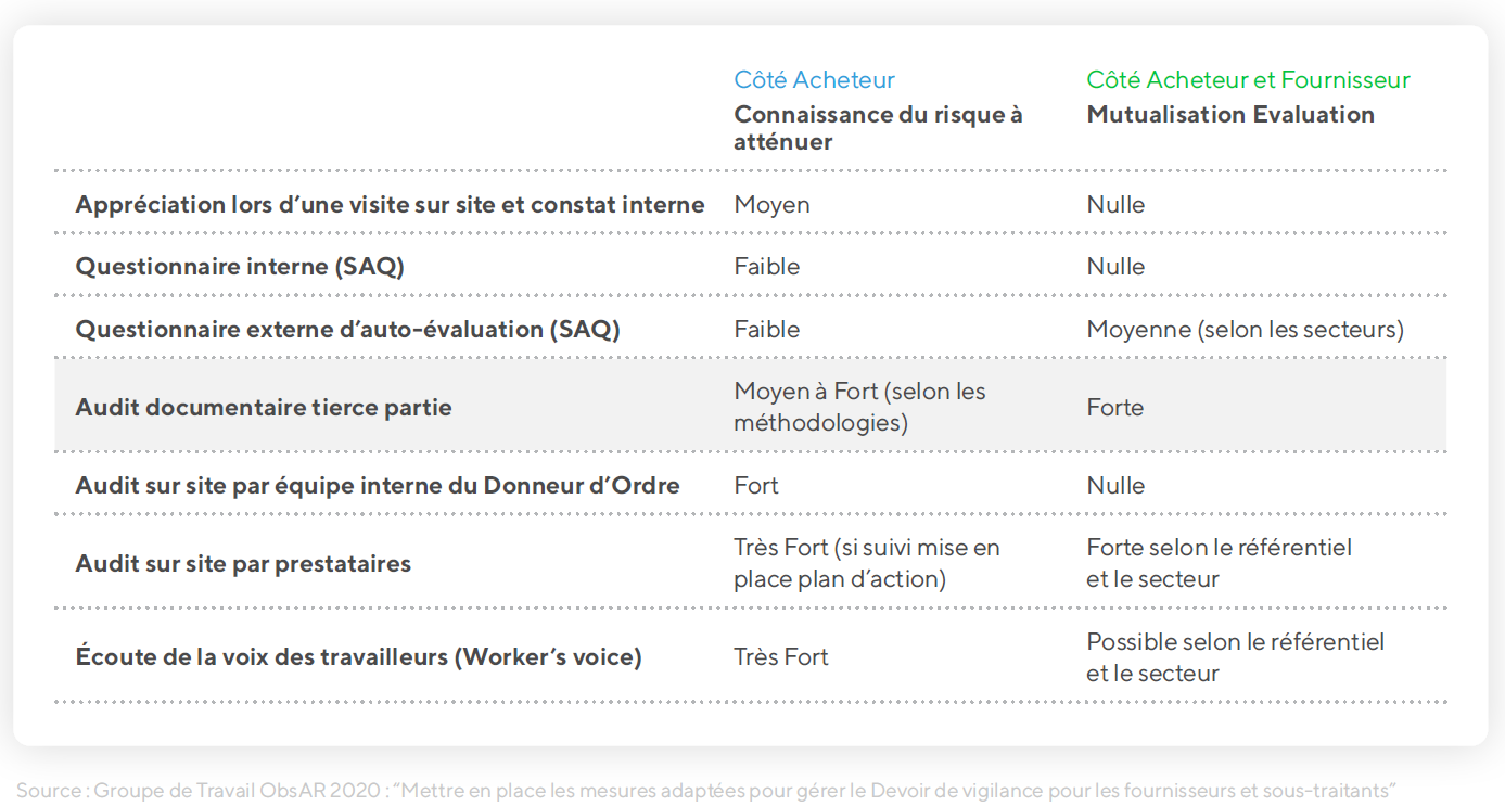 Un groupe de travail ObsAR a analysé 7 outils d'évaluation RSE en se plaçant à la fois du côté de l’acheteur et du fournisseur “Mettre en place les mesures adaptées pour gérer le Devoir de vigilance pour les fournisseurs et sous-traitants”.