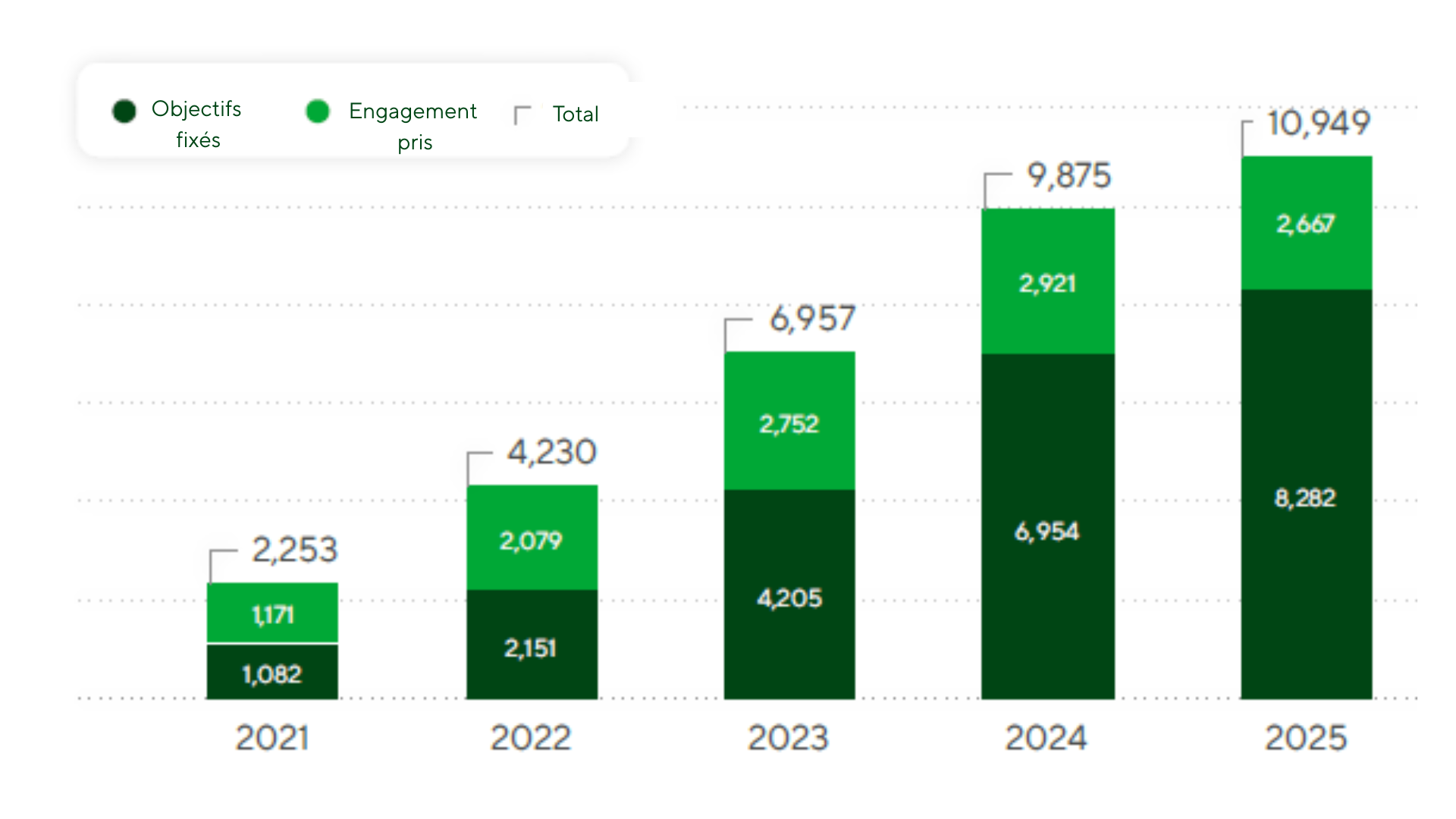 A mi-2025, près de 11 000 entreprises dans le monde ont défini ou validé des objectifs climatiques fondés sur la science (Science Based Target Initiative).