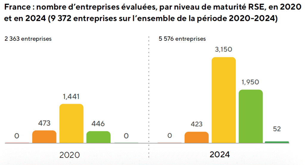 Pour la France, le calcul des moyennes des 4 scores thématiques se base sur 5 576 entreprises, sur un total de 48 714 entreprises de plus de 25 salariés évaluées en 2024 par EcoVadis.