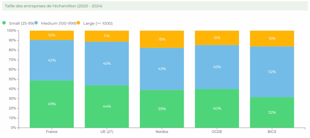 Les 21 pays sélectionnés restent identiques à l’édition précédente pour observer les progressions en 2 ans (évolution de 2022 à 2024). A noter, cinq pays (Finlande, Norvège, Australie, Turquie et Afrique du Sud) sur le classement des Grandes entreprises ont moins de 100 évaluations en 2024, ces résultats ne sont donc pas commentés (échantillon considéré comme trop faible sur la taille des 1000 salariés et plus)