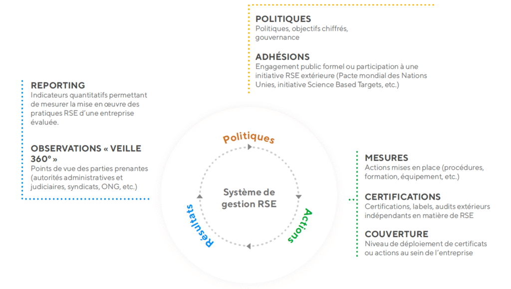 Chaque élément revêt une pondération particulière dans l’évaluation de la performance d’une entreprise pour un thème donné. Ces niveaux de management fondamentaux sont subdivisés en 7 indicateurs de management : Politiques, Adhésions, Mesures, Certifications, Couverture, Reporting et Observations “Veille 360°”.