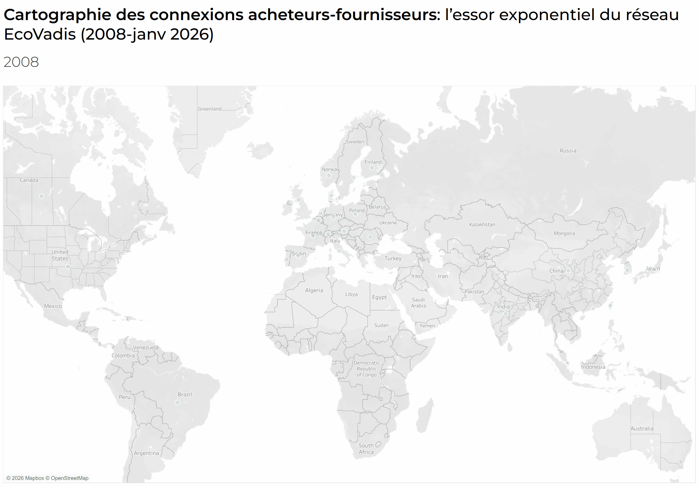 L’animation ci dessous présente la croissance exponentielle des connexions acheteurs-fournisseurs au fur et à mesure du développement du réseau EcoVadis, de sa création 2008 à fin janvier 2026. Preuve si besoin, du dynamisme de l’inclusion des évaluations de durabilité dans les relations d’affaires.
