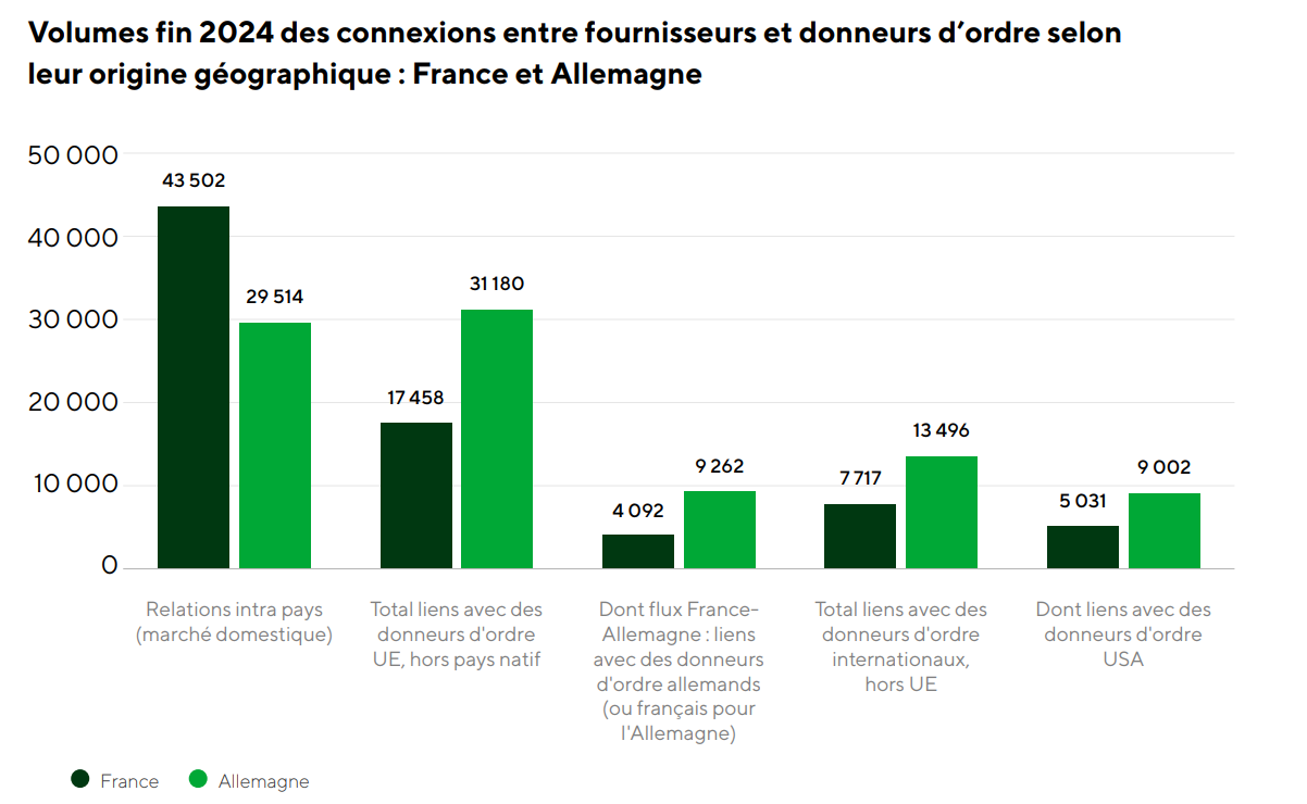Cet écart est encore plus marqué lorsqu’il s’agit de connexions à l’export : les fournisseurs allemands créent près de deux fois plus de liens avec des entreprises étrangères, notamment vers les États-Unis, la France ou la Suisse.