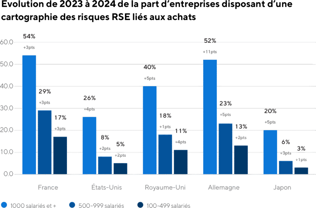En 2024, 54% des Grandes entreprises françaises de 1000 salariés et + disposent d’une cartographie des risques RSE des achats, contre 47% pour les entreprises de même taille dans l’UE.