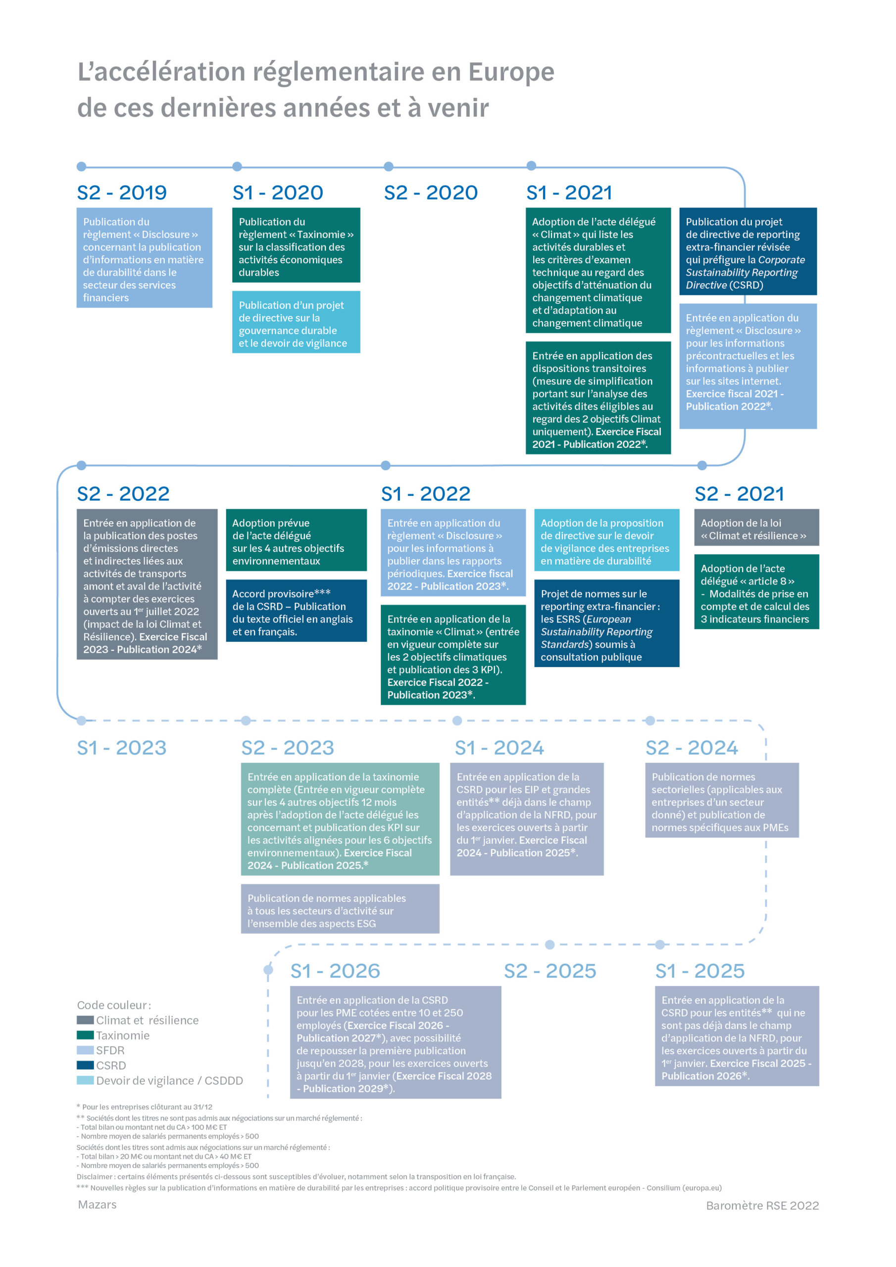 Les éléments présentés dans la première partie du baromètre sont issus de l’analyse des informations publiées par les émetteurs du CAC 40, du Next 25 et du Last 15 du SBF 120, dans le dernier Document d’Enregistrement Universel (DEU) disponible (première clôture post 31/12/2021). Les sociétés ne relevant pas du droit français ont été exclues de notre panel, ainsi que quatre sociétés ne publiant pas leur propre rapport (données incluses dans le rapport de sa maison-mère, intégré à notre panel) et deux sociétés ne publiant pas une DPEF réglementairement car elles ne dépassent pas les seuils définis par la loi. À noter que les exemples présentés en illustration concernent les entreprises incluses dans le panel retenu en 2021. Les références sont citées en légende des illustrations présentées.