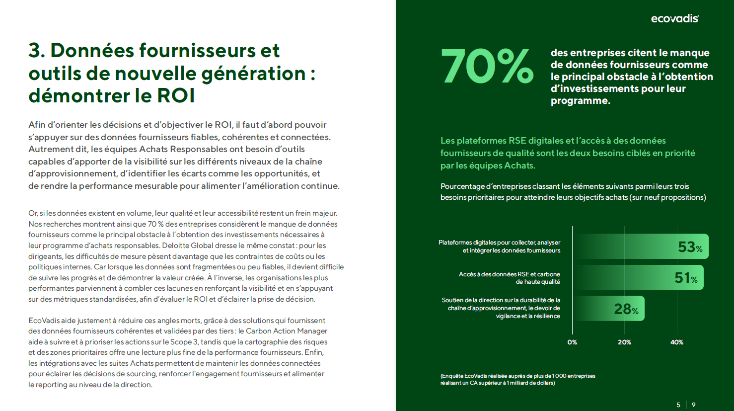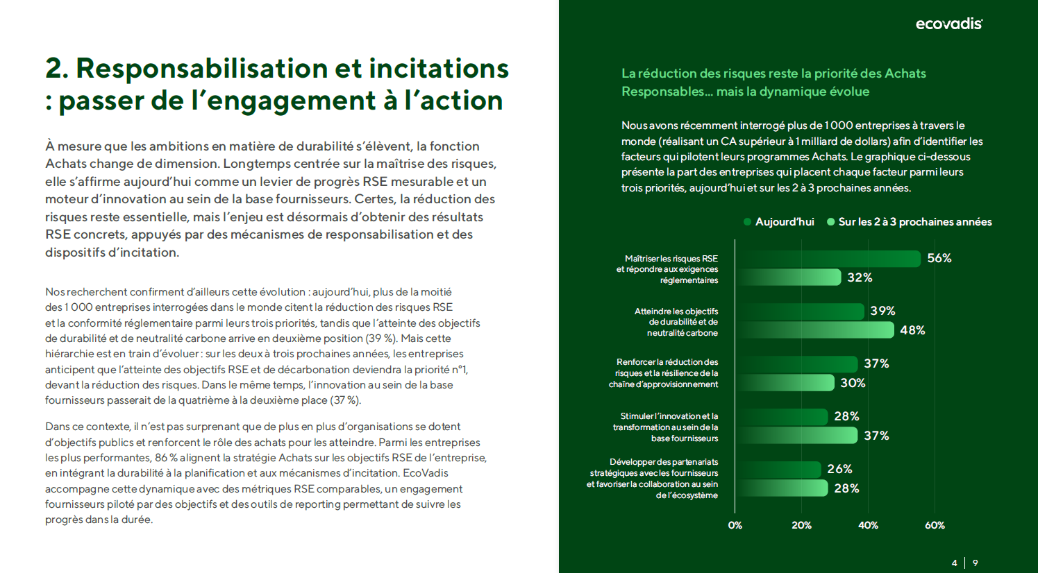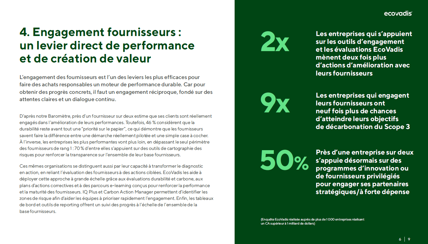 Lors de la session Bonnes pratiques : les actions qui créent de la valeur: seuls 17 % des fournisseurs se disent fortement motivés par leurs clients sur les enjeux de durabilité, alors que beaucoup citent des incitations commerciales (engagements de volume, conditions préférentielles) comme les véritables accélérateurs capables de faire bouger les lignes plus vite. (Voir plus à la page 7 de l’ebook Cinq leviers de création de valeur en Achats responsables)