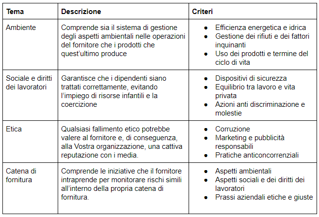 Molti uffici di approvvigionamento sostengono che un approccio olistico possa apportare enormi vantaggi. Con un’iniziativa comune di sostenibilità e conformità attraverso un programma di RSI centralizzato che non solo valuta proattivamente tutti i fornitori, ma comprende anche un’iniziativa di monitoraggio continuo. Ecco una panoramica dei criteri importanti da considerare per trovare una soluzione: