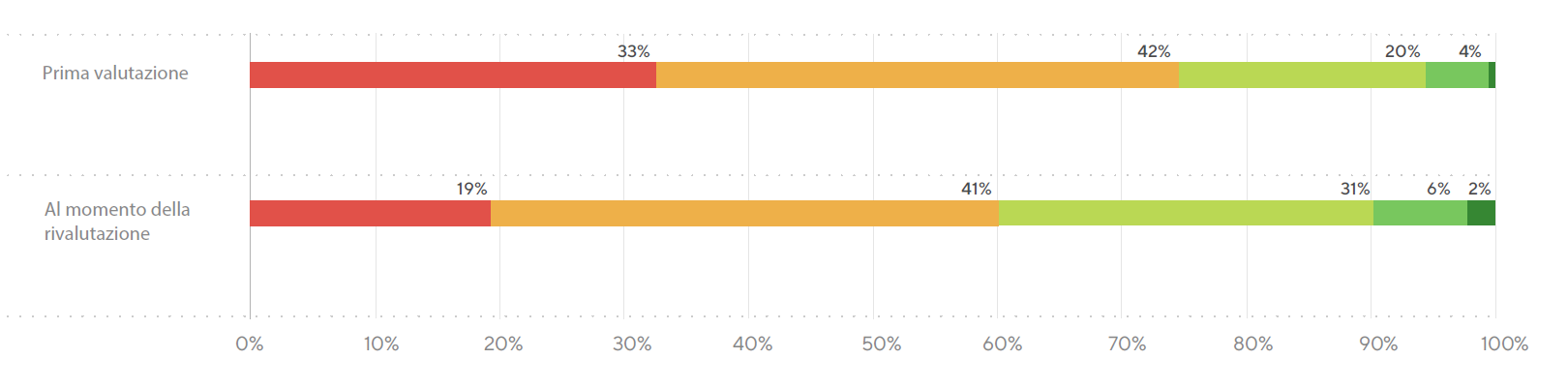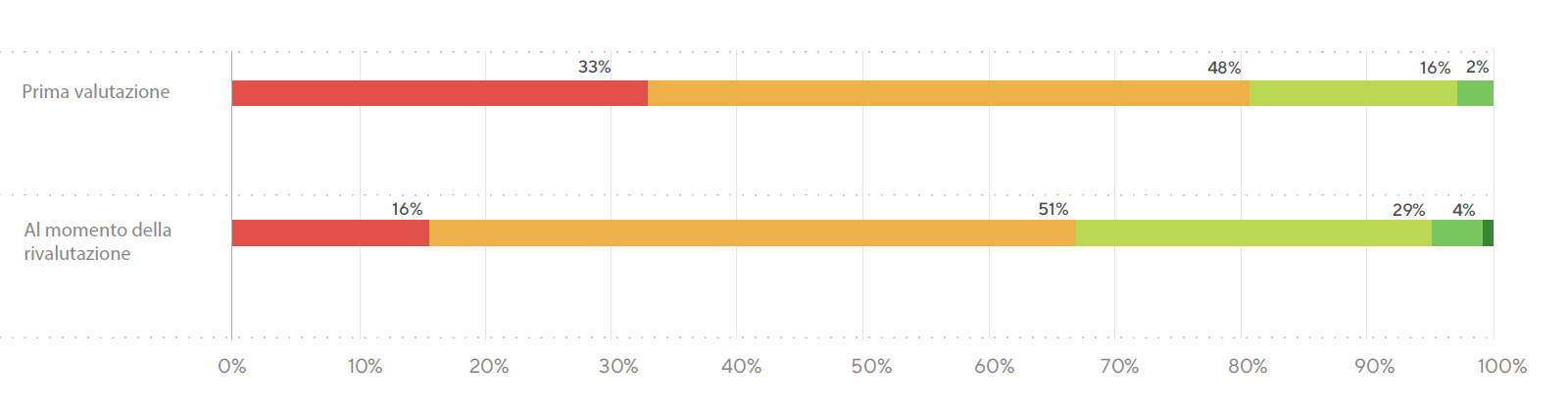 Ma questa media complessiva racconta solo una parte della storia: molti fornitori sono al secondo anno di utilizzo del Carbon Action Module e quelli che sono stati rivalutati stanno superando in modo significativo il network di riferimento (una valutazione). Questo si sta dimostrando vero per le aziende di qualsiasi Paese, settore o dimensione. Come mostra la figura seguente, in Italia la percentuale di aziende al livello Insufficiente si è ridotta dal 33% al 16% dopo la rivalutazione. La percentuale di aziende con livello Avanzato è aumentata dal 16% al 29%, quasi raddoppiando lo score in soli due anni.