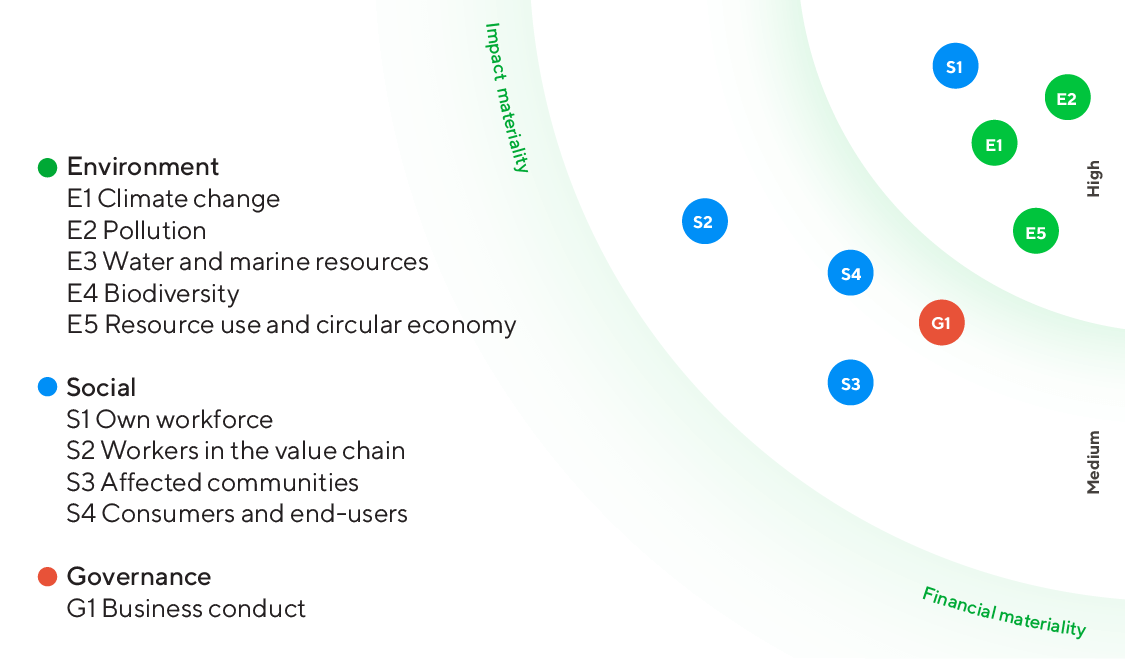 The materiality matrix to the right shows how different E, S and G factors (as outlined in the associated ESRS) can be assessed against two dimensions: financial and impact materiality. The position on the horizontal axis is determined by how much a sustainability-related factor can affect a company financially. The position on the vertical axis is determined by estimating a company’s actual or potential impacts on people or the environment.